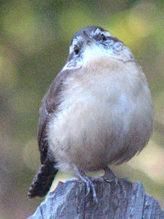 As usual, our backyard feeders are attracting lots of House Finches all day every day. Now that it's colder in the mornings, they have their feathers puffed up so much that they all look grossly overweight. The same is true of the Carolina Wren that has recently taken to singing on our fence in the mornings and then visiting the feeders. Usually a very trim-looking bird, this one looks anything but trim at present.
