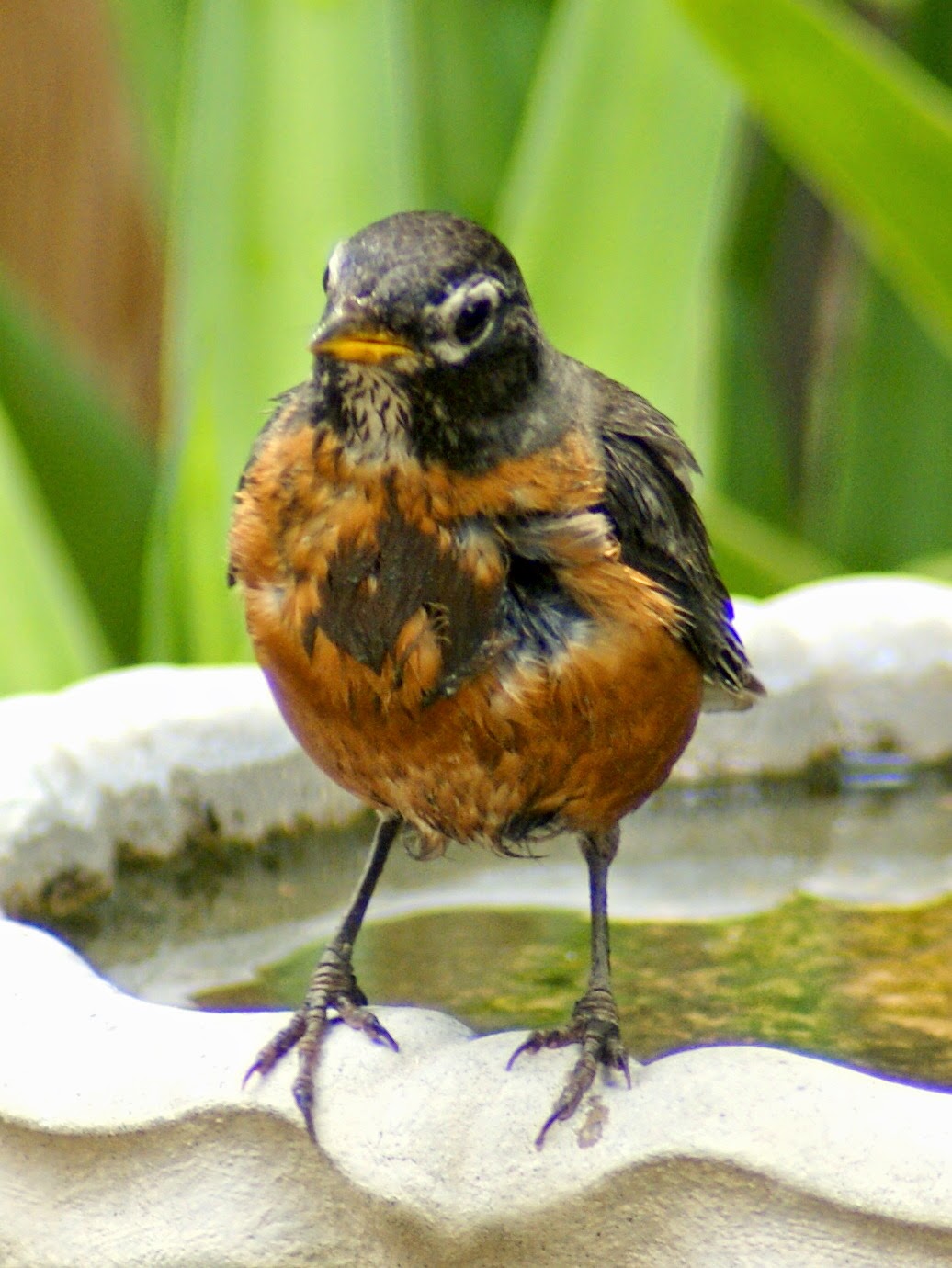 We have a lot of young birds in our yards at present, including Carolina Wren, Northern Cardinal, House Sparrows, Northern Mockingbird, Downy Woodpecker and Red-bellied Woodpecker. So when I saw an American Robin with less than perfect plumage, my first thought was that it was a fledgling. But when I looked more carefully, I realized it was an adult in molt. It seems that Robins enter molt much earlier than our other yard birds.