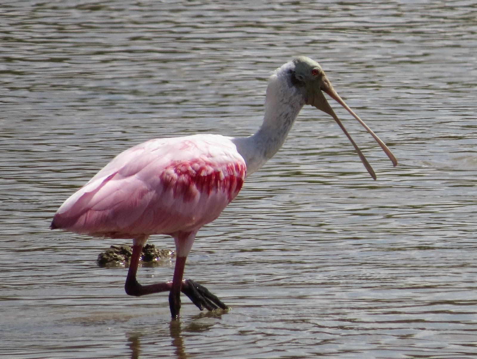 A Roseate Spoonbill was wandering around, closely followed by a Laughing Gull.